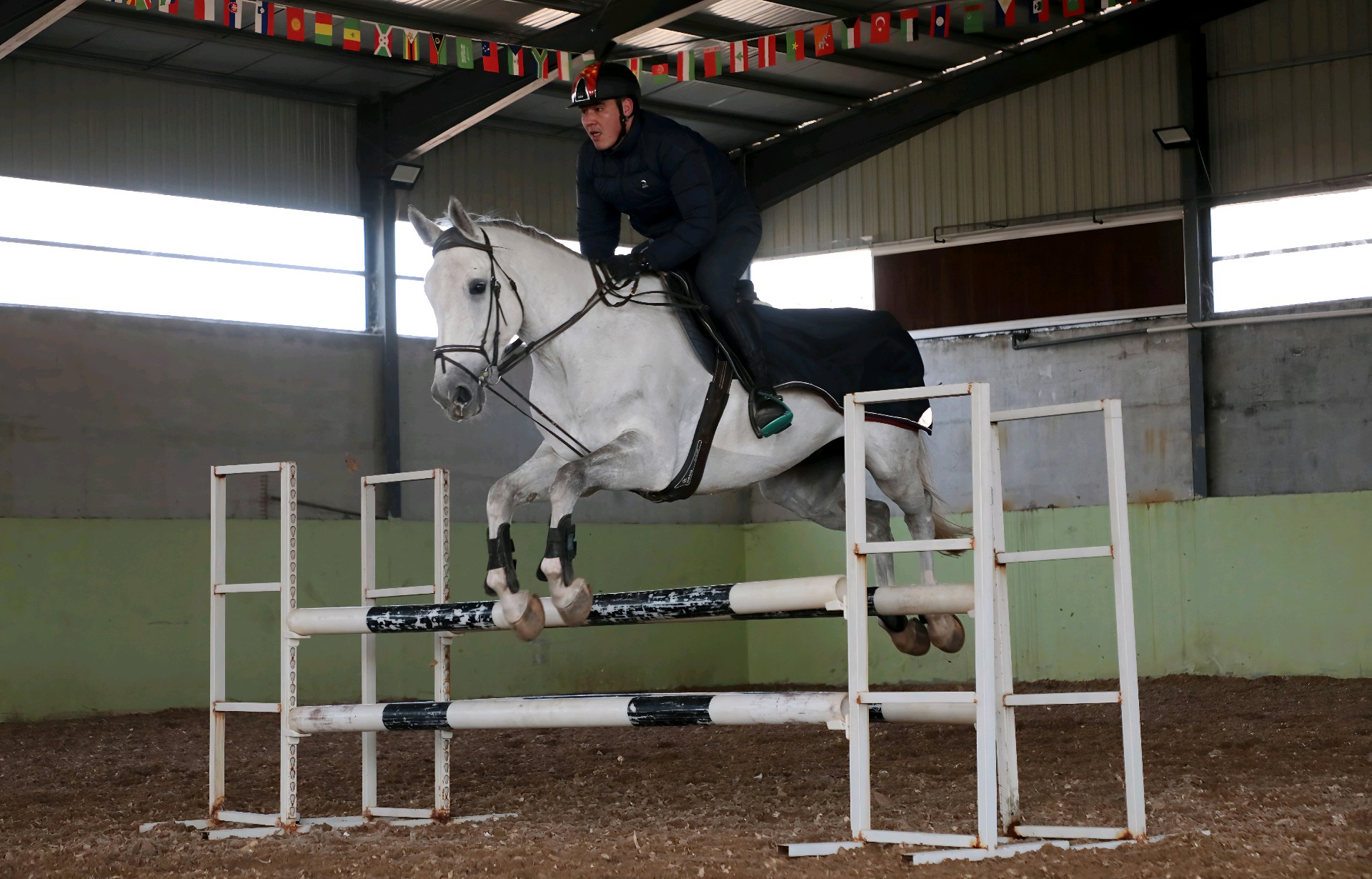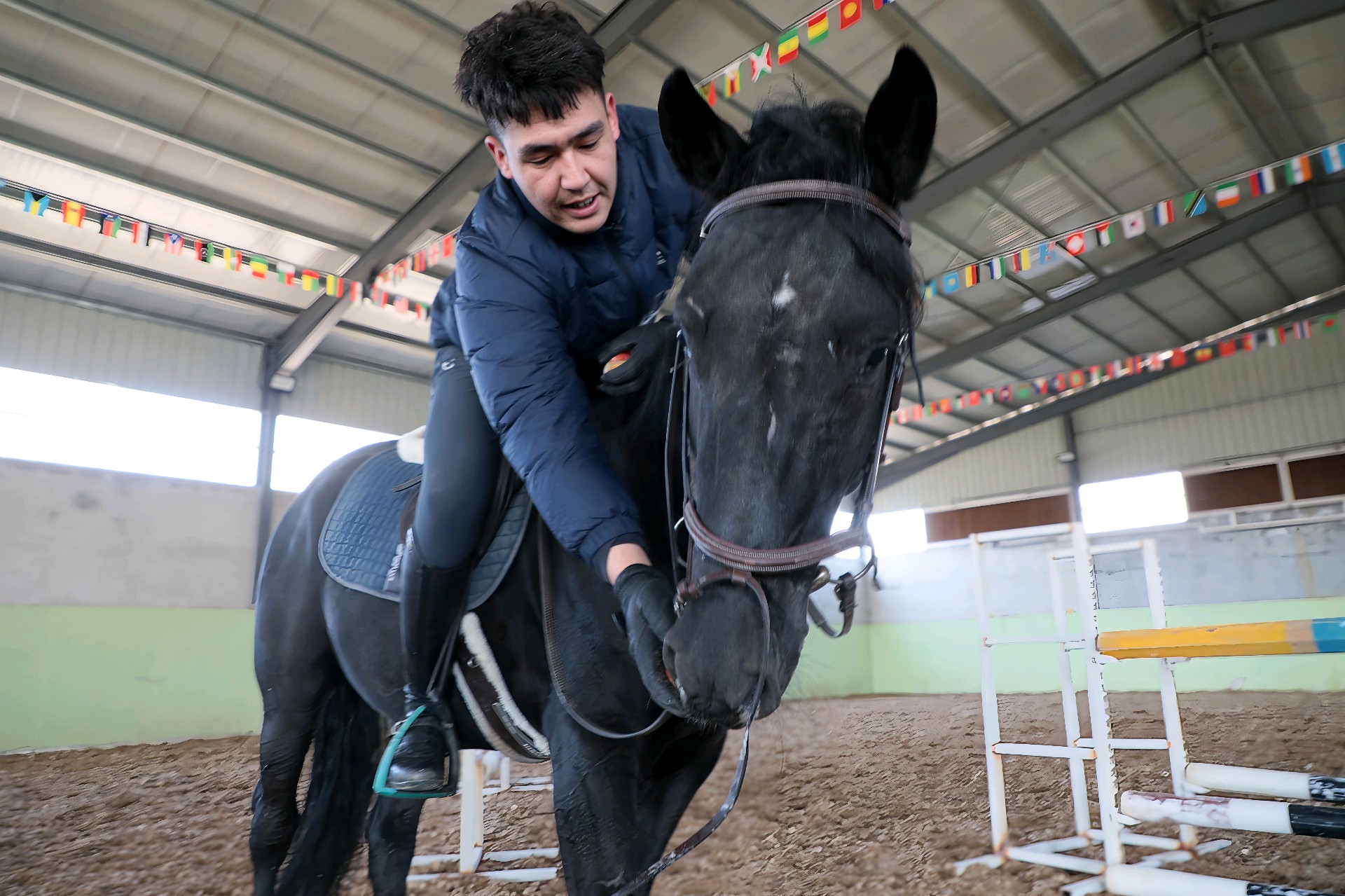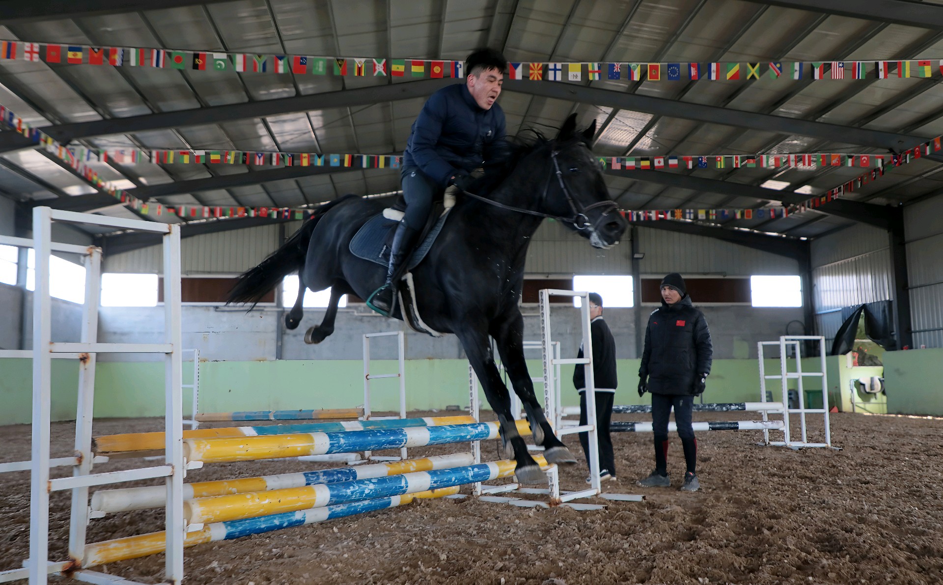 1月12日,位于无棣县西城工业园的乾骥(滨州)竞技马房的训马师正在练习马术(越野障碍赛)。