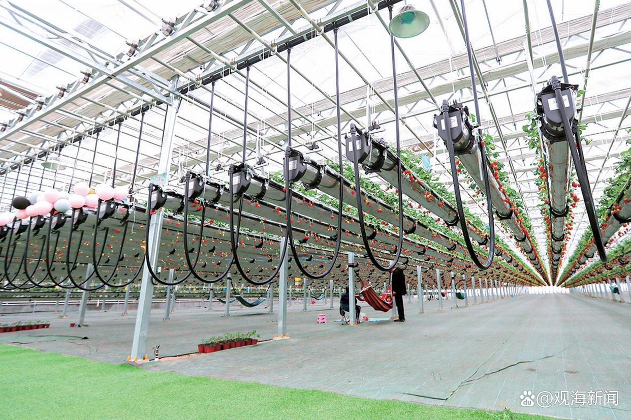 青岛绿沃川农业科技有限公司的草莓通过“高架基质栽培技术”悬挂生长。图源:观海新闻