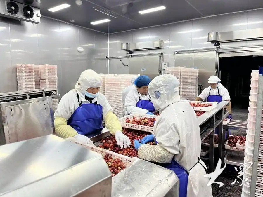 临沂市推动超高压杀菌、真空冻干等技术应用于草莓加工,集中力量建设冷链物流基地,筑牢产业基础设施。图为大宇食品的工人在分拣草莓。图源:大众新闻