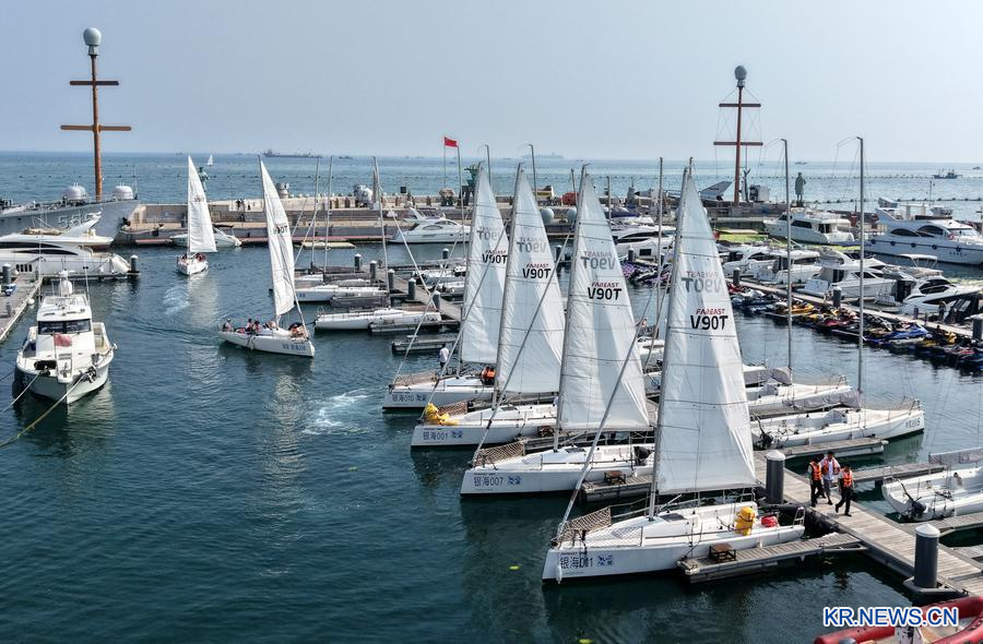 2025년 7월 10일 산둥(山東)성 칭다오(青島)시 인하이(銀海)대세계 부두에서 해상 투어 행사에 참여하기 위해 승선하는 시민과 여행객을 드론으로 담았다. (사진/신화통신)