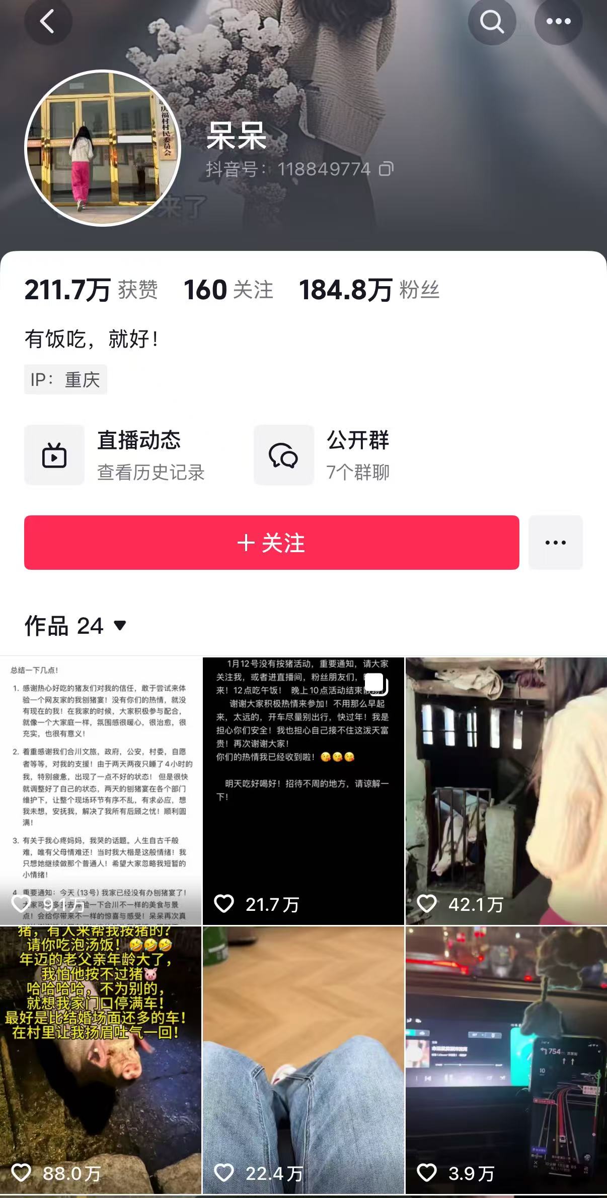 1月9日,重庆市合川区云门街道庆福村女孩呆呆在网上求助称,因父亲年龄大了,担心11日家里杀猪时按不住,希望能有人帮忙按猪。11日至12日,呆呆家中连续两天热闹非凡,网友们慕名而来,最高峰同时在现场人数有3000人左右,两天的总人数估计有上万人,据红星新闻,晚饭结束后,“呆呆”在众人欢呼下走到人群中心,为大家送上新年祝福,现场气氛燃到最高点。呆呆本人也走红网络,目前,其抖音粉丝达184万。