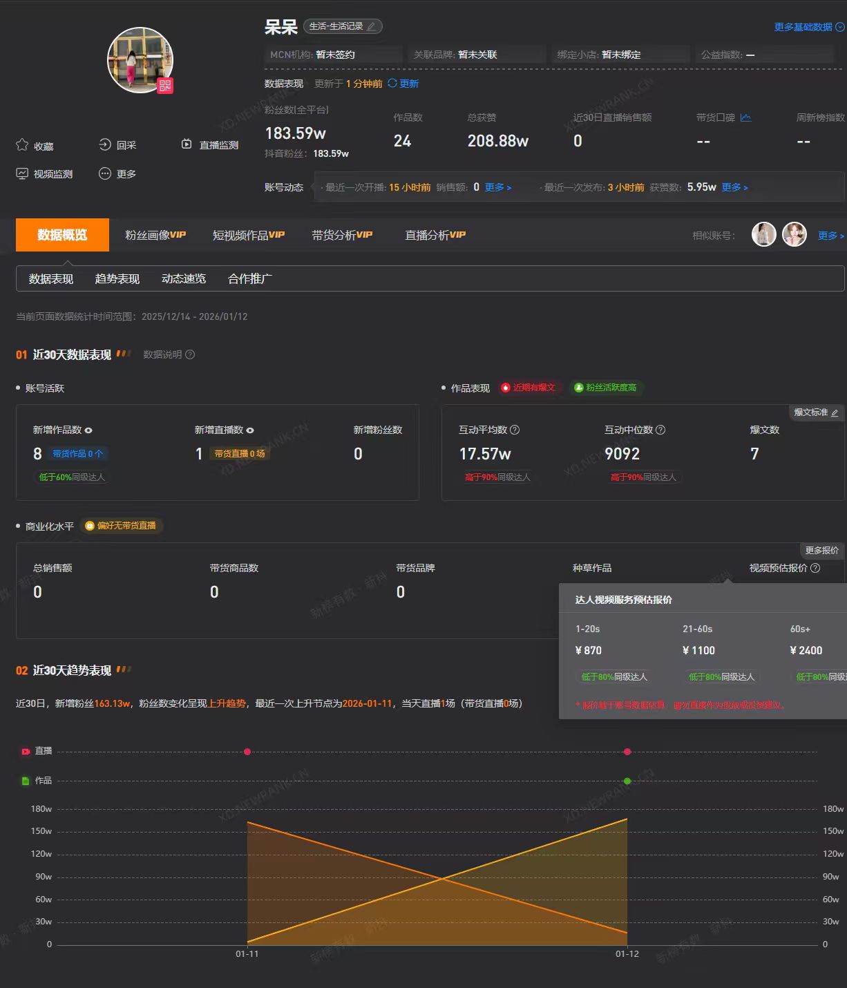 从第三方数据获悉,目前“呆呆”视频平台粉丝量已超180万。商业化水平显示,其1-20s视频广告报价为870元,21-60s视频广告报价为1100元,60s以上视频广告报价为2400元。企查查显示,“呆呆”商标已被申请注册,国际分类涉及设计研究、科学仪器、日化用品等,当前商标状态多为已注册。