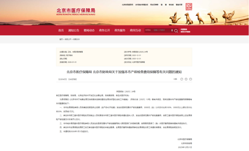 北京市医保局近日发布新政,自2026年1月1日起全面提高各类医保参保人员的产前检查费用保障水平。这个一揽子政策中包含了一个引人注目的条款:享受北京市职工医保待遇的退休人员,发生的医保范围内产前检查费用,可按照生育保险标准报销。