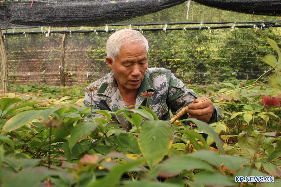 산둥(山東)성 웨이하이(威海)시 원덩(文登)구의 재배 기지에서 한 농민이 서양삼 묘목의 생장 상태를 살펴보고 있다. (사진/신화통신)