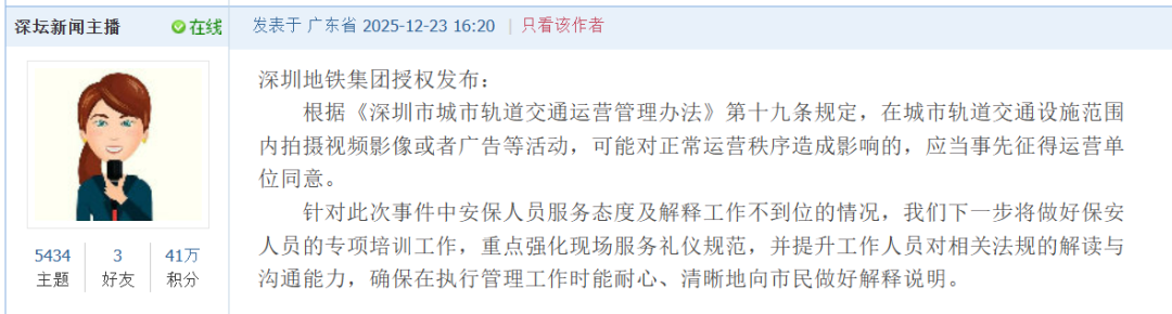 针对此次事件中安保人员服务态度及解释工作不到位的情况,深圳地铁集团下一步将做好保安人员的专项培训工作,重点强化现场服务礼仪规范,并提升工作人员对相关法规的解读与沟通能力,确保在执行管理工作时能耐心、清晰地向市民做好解释说明。