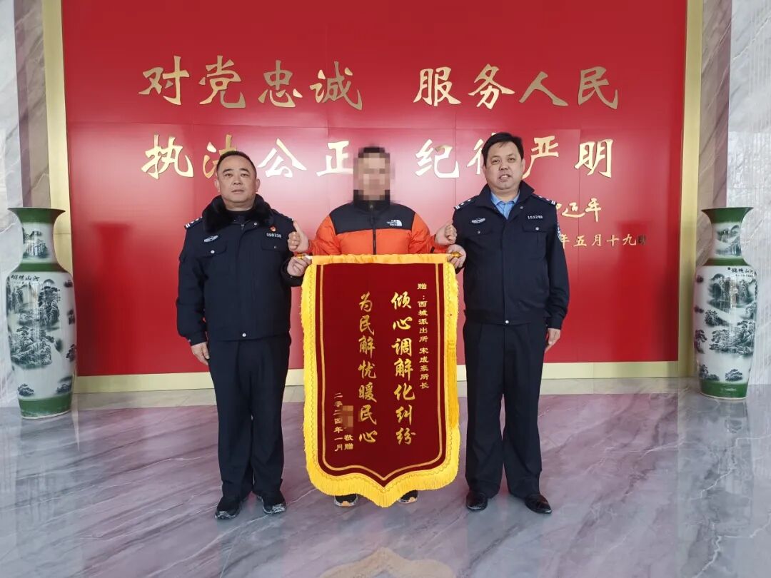 2024年2月5日,姜先生将一面印有“倾心调解化纠纷 为民解忧暖民心”的锦旗送到西城派出所副所长战中华手中,感谢帮其及时化解三年的纠纷难题,促进了和谐稳定。