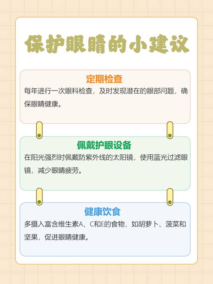 保护眼睛:别过度用眼,避免眼睛被撞到。
