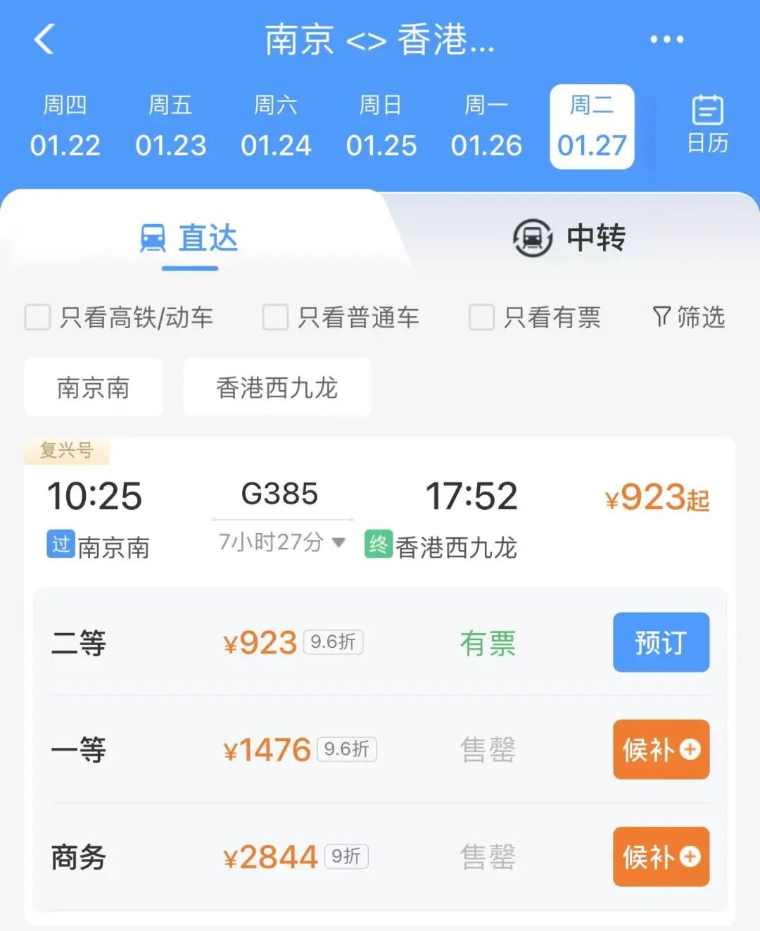 刚刚,从铁路12306查询获悉,1月27日南京至香港直达高铁一等座、商务座已显示“售罄”。