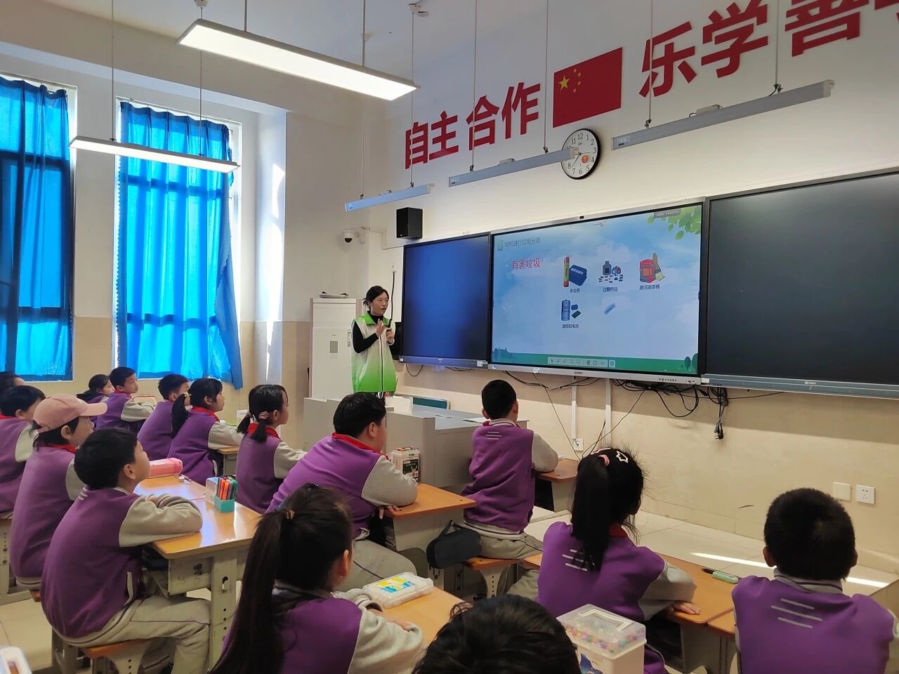 在核心的分类标准讲解环节,宣讲团老师通过图文对照的方式,针对日常生活中易混淆的废旧电池、过期药品、一次性餐具、外卖包装盒等物品,逐一进行具象化说明,结合实物图片标注分类属性,帮助同学们精准掌握区分方法。讲解“分类后去向”时,老师以本地垃圾处理流程为蓝本,用通俗的语言介绍各类垃圾经分类后,如何通过转运、加工、降解等环节实现资源化利用,让同学们清晰感知自身分类行为与环保成效的直接关联,增强了践行垃圾分类的成就感与责任感。