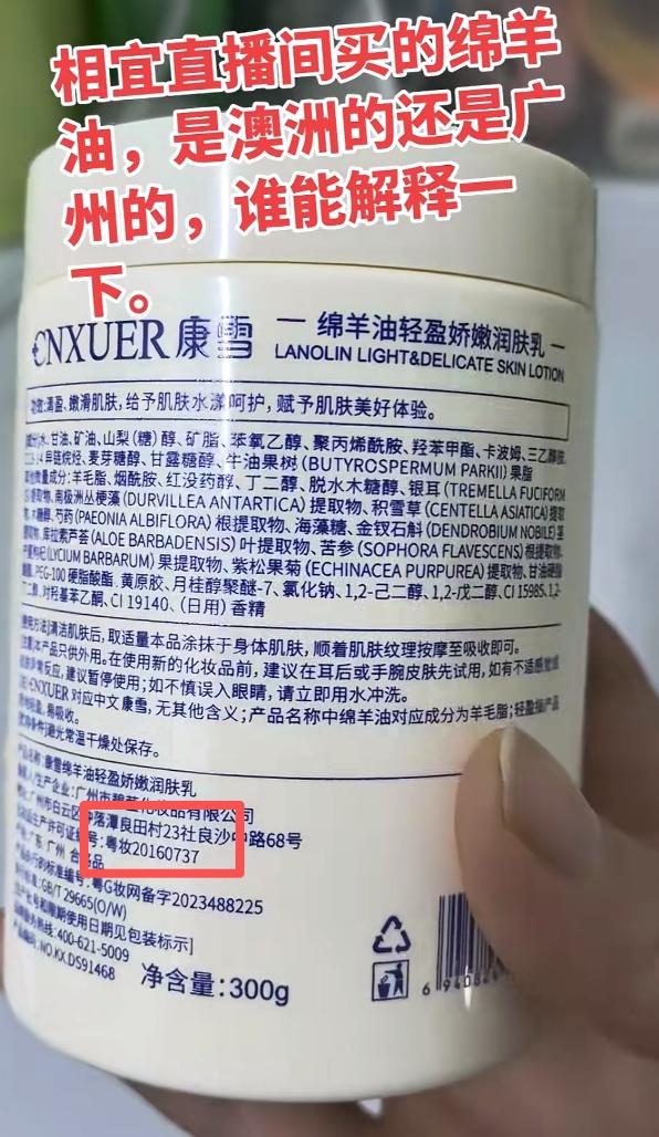 王先生还介绍,2025年12月24日,“相宜”在澳洲悉尼歌剧院直播带货康雪绵羊油时,宣称其绵羊油系“澳洲产地”,但有网友收到货后发现,产品实为广州生产的国产化妆品。