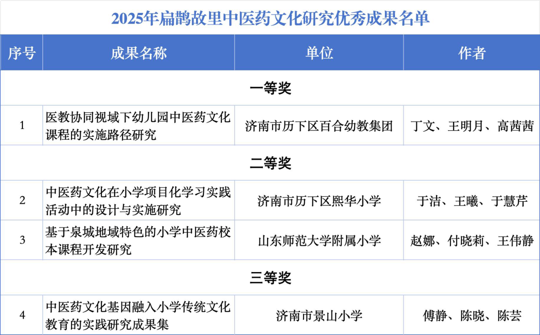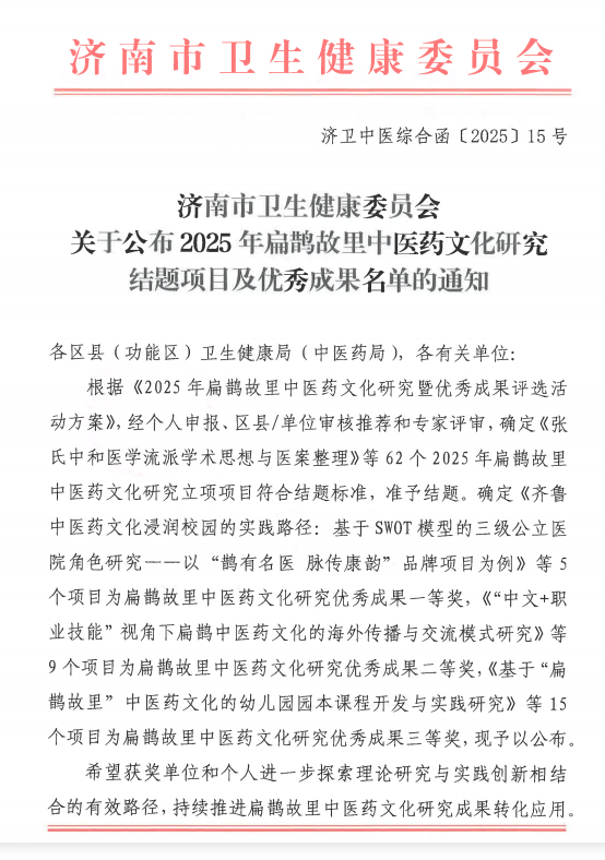 近日,济南市卫生健康委员会公布《2025年扁鹊故里中医药文化研究优秀成果》名单,历下区4所学校的研究成果分别荣获一、二、三等奖,生动展现了历下区在推进中医药文化进校园、深化中华优秀传统文化教育方面的扎实探索和显著成效。