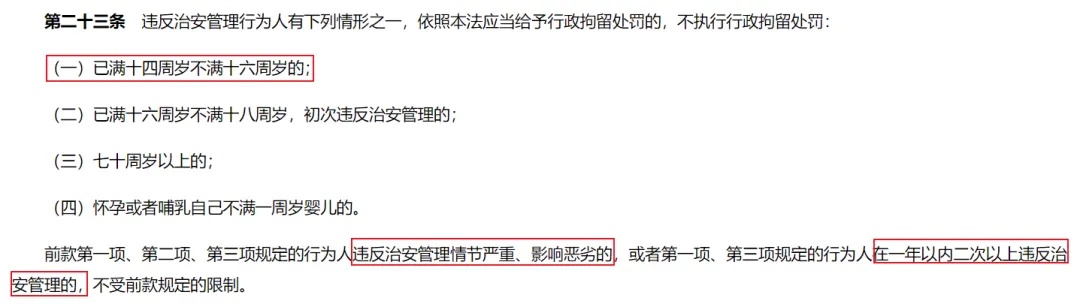 据了解,新修订的《中华人民共和国治安管理处罚法》对未成年人违法处罚条款作出调整,改变了以往对14至16周岁未成年人违法不执行拘留的规定,明确对该年龄段未成年人违反治安管理、情节严重且影响恶劣的,或一年以内二次以上违反治安管理的,可以执行行政拘留。