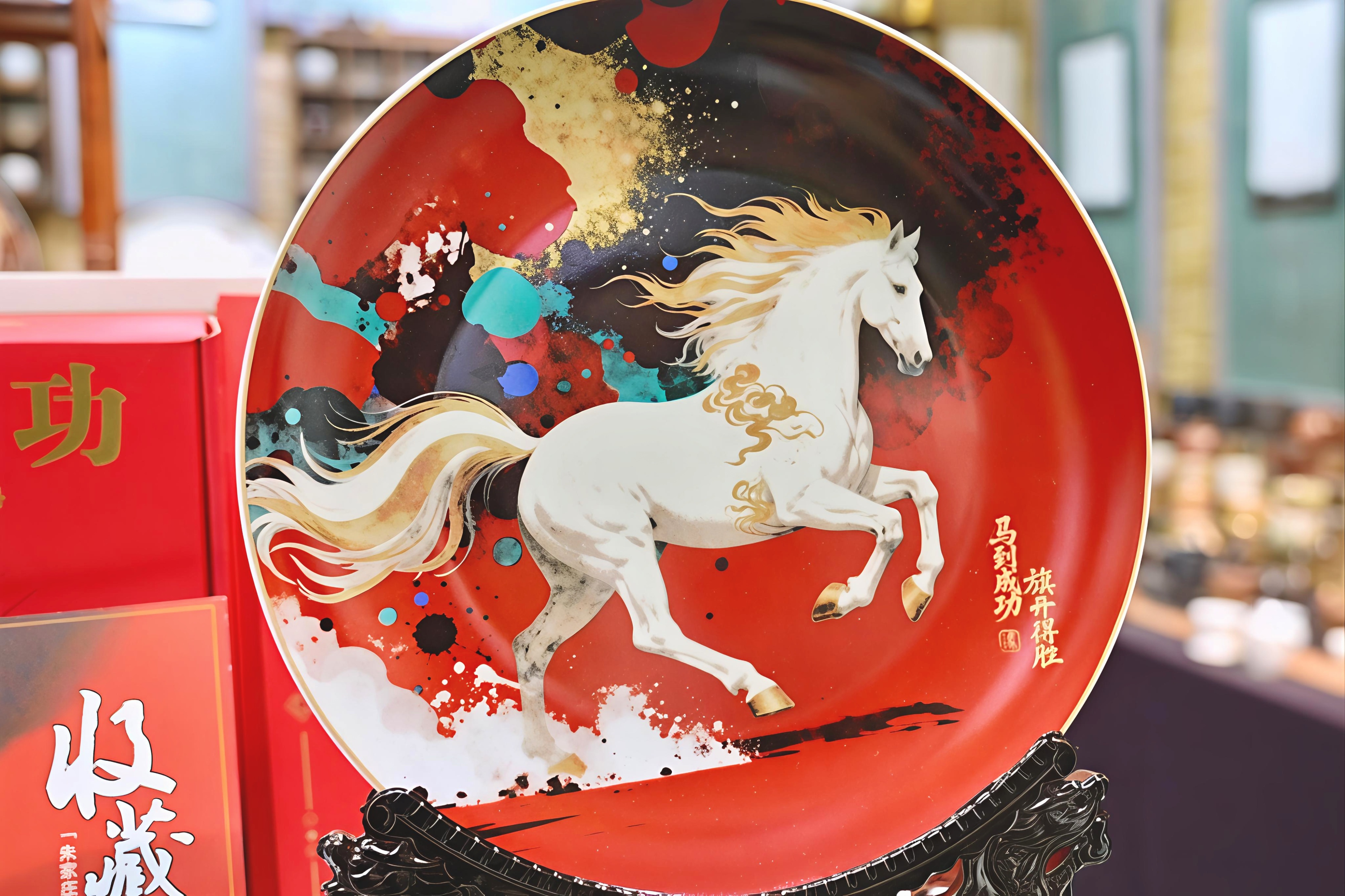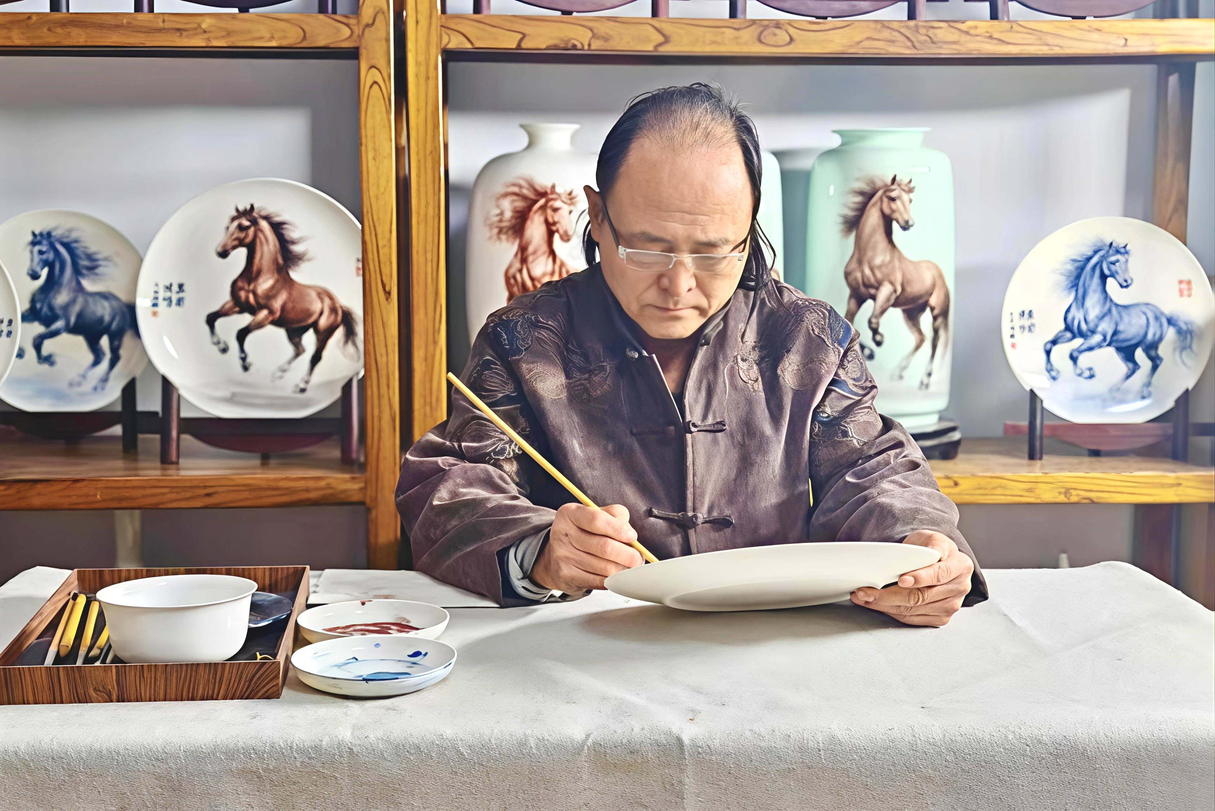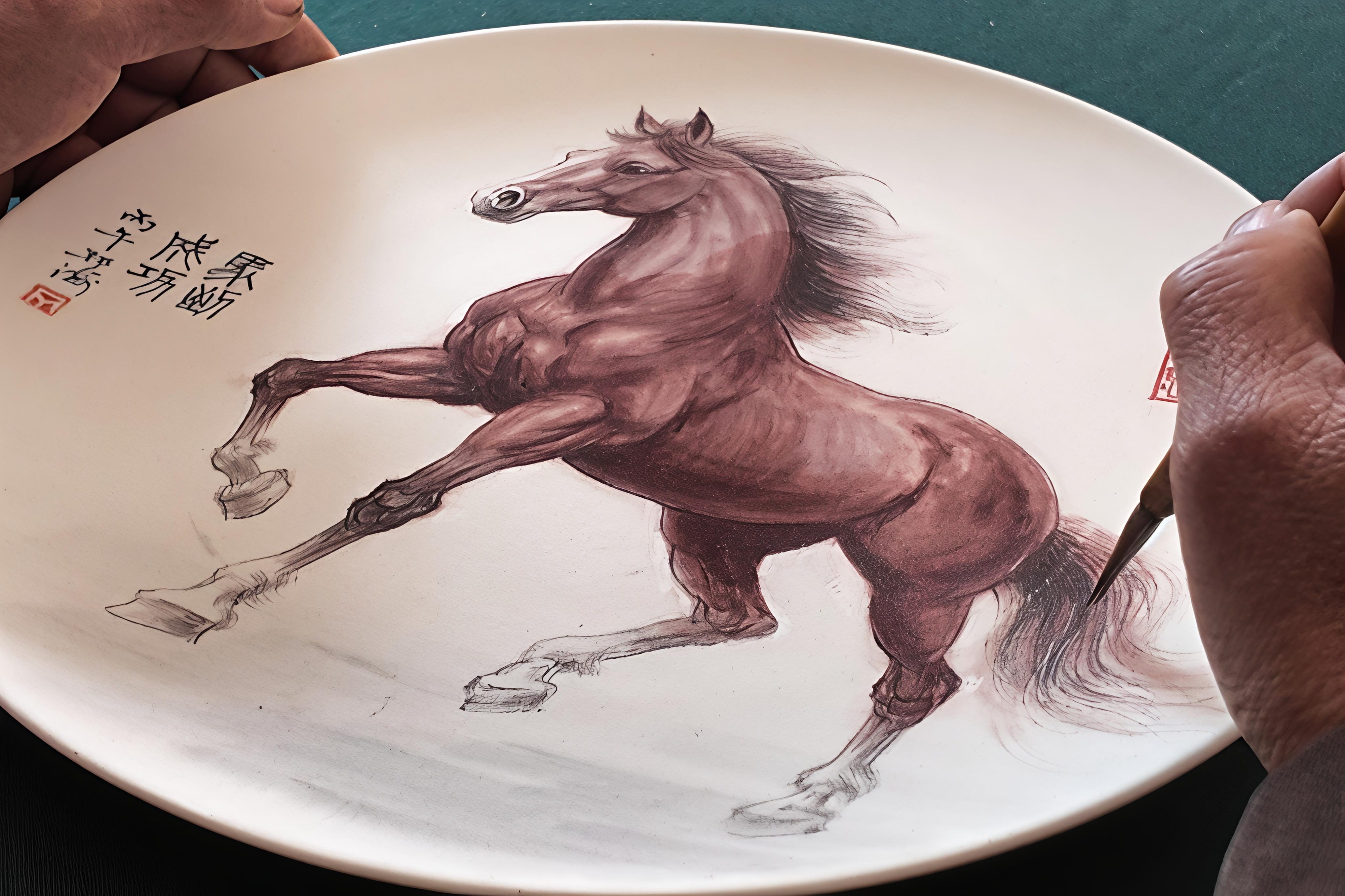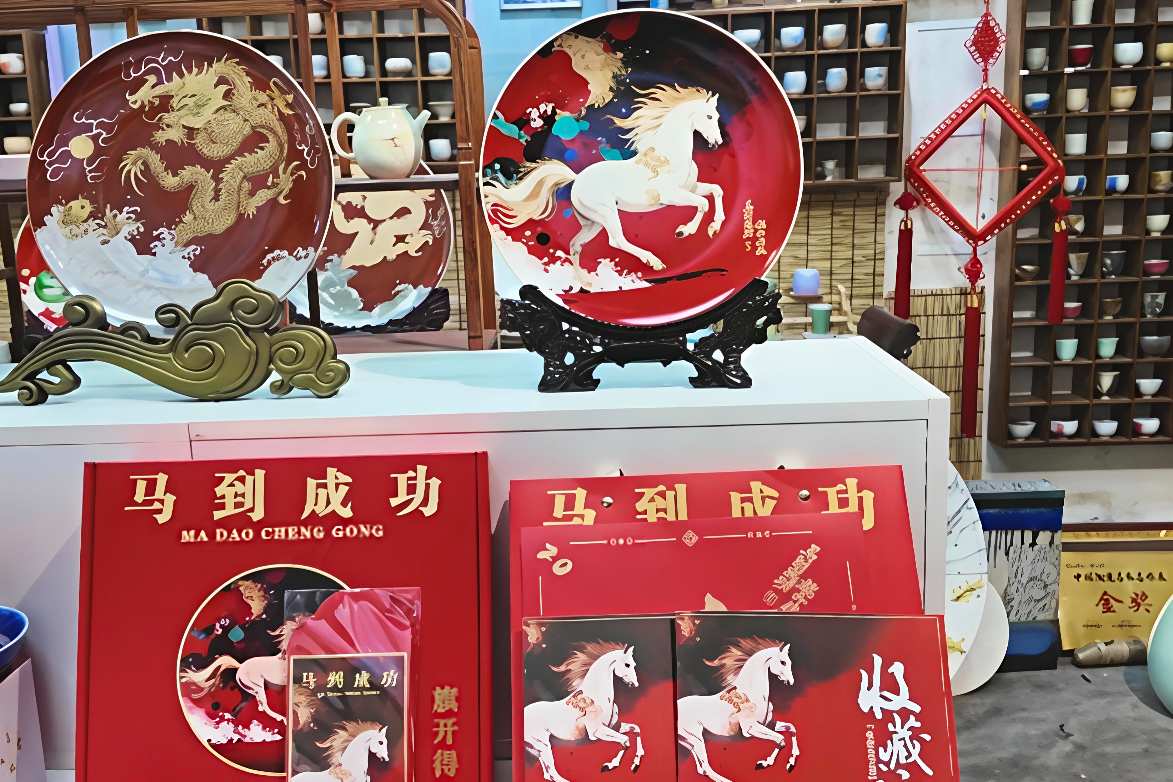 1月13日,走进朱家庄国际艺术村的大师工作室,陶泥的温润与年味的喜庆扑面而来。中国陶瓷艺术大师丁邦海笔下的骏马,或昂首长嘶或扬蹄欲驰,遒劲线条间尽显奋进风骨;山东省陶瓷艺术大师纪宏以高温釉下彩工艺精雕细琢,每一件瓷盘都凝聚匠心与祝福;张源源选用中国红为底,以水墨泼彩勾勒金色奔马,寓意奔向朝阳的吉祥愿景;山东理工大学硕士生导师尹大中则以细腻刻瓷技艺,让淄博窑火温度融入马匹奔腾纹理,实现传统工艺与新春气息的共生。