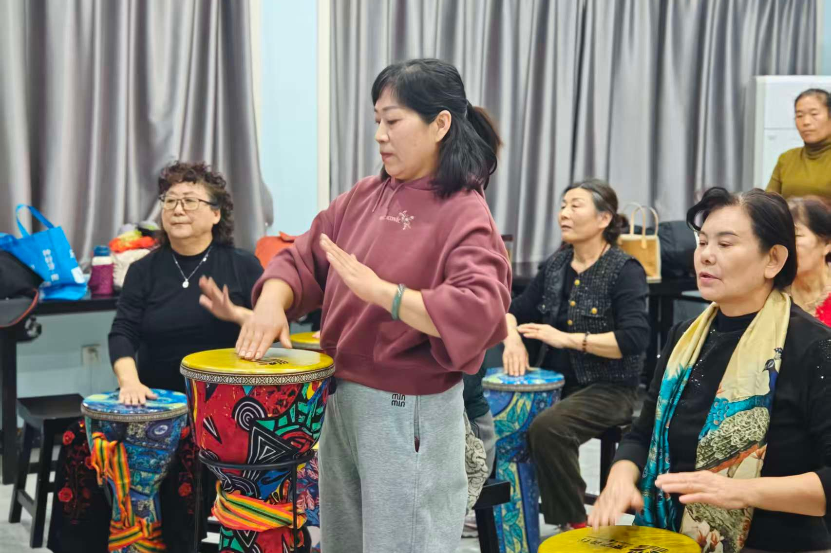 活动现场,学员们围坐一圈,跟着李老师认真学习握鼓姿势、基本节奏打法,老师手把手纠正动作,耐心讲解技巧;老学员们熟练地敲击鼓面,明快的鼓点此起彼伏,还主动帮助身边的新手,分享自己的练习心得。鼓点声时而轻快活泼,时而沉稳有力,居民们随着节奏晃动身体,脸上洋溢着欢快的笑容,现场气氛热烈而融洽。