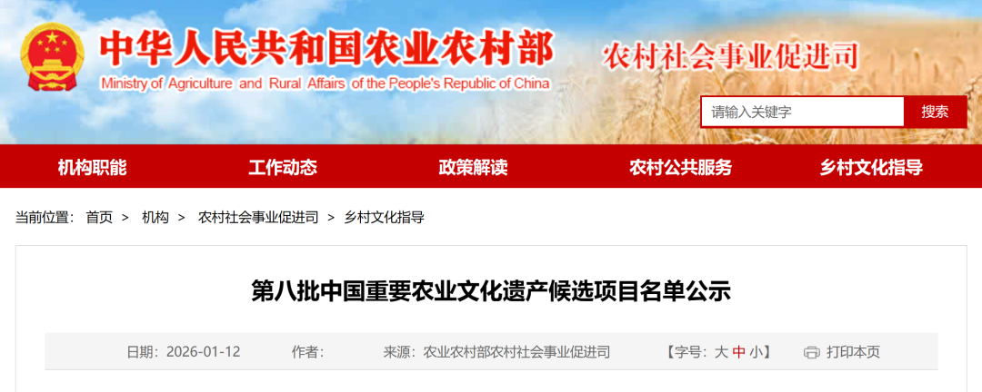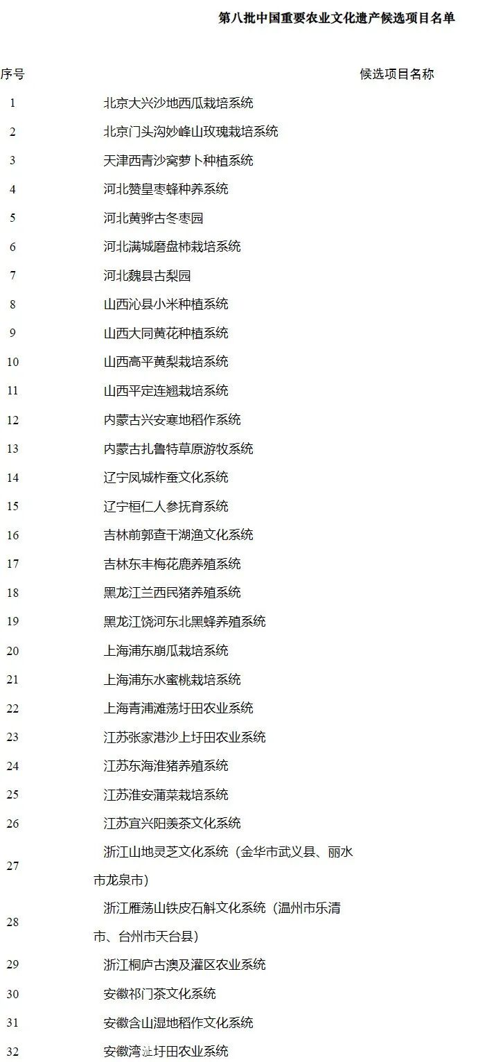 按照《农业农村部办公厅关于开展第八批中国重要农业文化遗产挖掘工作的通知》(农办社〔2024〕11号)要求,经过市县申报、省级推荐、专家评议和司局审核,拟将“北京大兴沙地西瓜栽培系统”等90项传统农业系统列入第八批中国重要农业文化遗产候选项目名单(见附件),现予以公示。