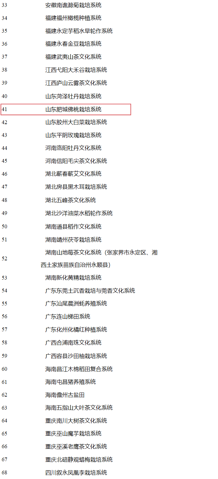 1月12日,农业农村部农村社会事业促进司发布《第八批中国重要农业文化遗产候选项目名单公示》,90项传统农业系统列入第八批中国重要农业文化遗产候选项目,其中,山东肥城佛桃栽培系统入选。具体如下: