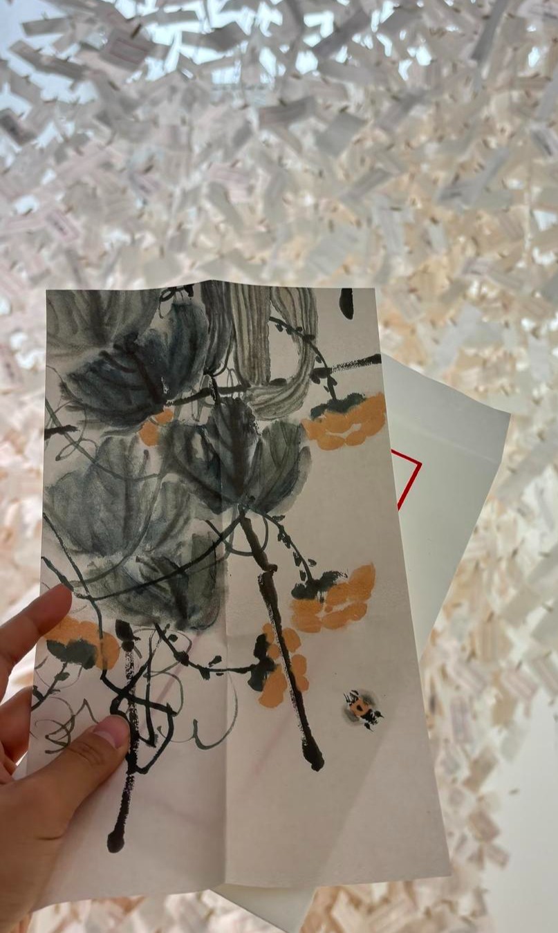 装置的每个细节都体现匠心。据了解,装置中的信封采用宣纸材质,质感温润且有年代感;信封上的“白石老人”等字样为冯羽亲笔手写;信封内的画作也经过精心挑选,画面主体非常适宜做笺纸,雅俗共赏。