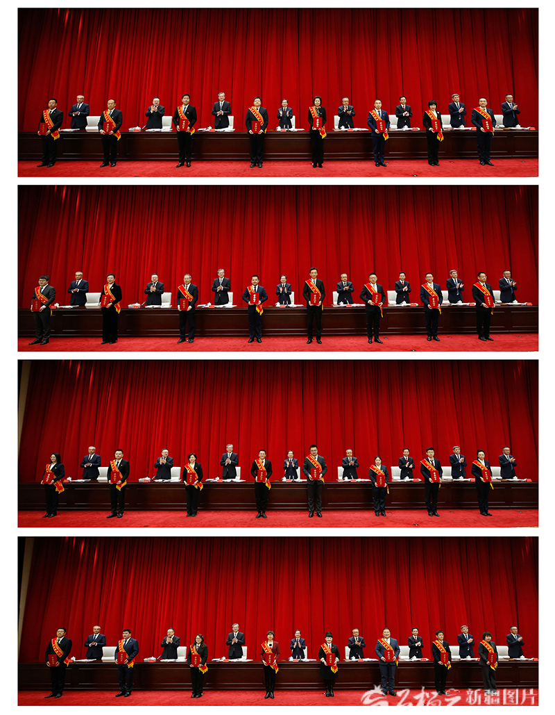 会上,自治区党委书记陈小江,自治区党委副书记、自治区主席艾尔肯·吐尼亚孜等领导为获得“新疆杰出人才奖”的代表颁发荣誉证书。天山网-新疆日报记者 谢龙摄