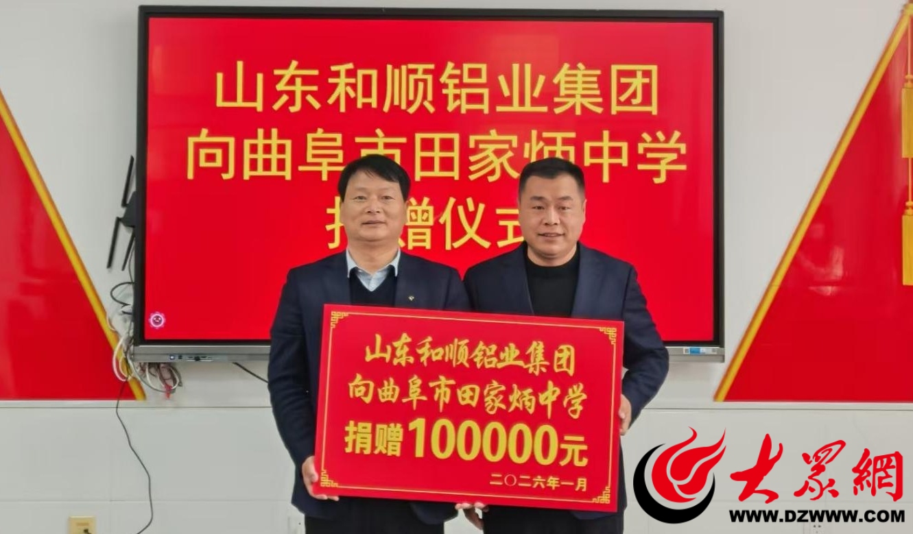 1月6日,山东和顺铝业集团爱心捐赠仪式在曲阜市田家炳中学举行,山东和顺铝业集团董事长张相宝,曲阜市田家炳中学校长邱树成参加捐赠仪式。