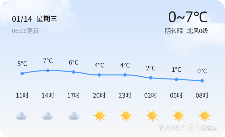 今日是2026年1月14日,星期三,农历十一月廿六。菏泽市天气阴转晴,当前温度0.7摄氏度,北风0级,空气湿度76%。由于PM2.5浓度为205,空气质量状况为中度污染,建议市民外出时佩戴口罩,减少户外活动,尤其是敏感人群。