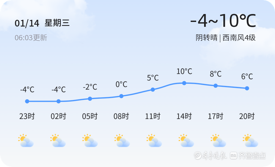 今天是2026年1月14日,星期三,农历十一月廿六。烟台市今日天气为阴转晴,气温范围在-4℃至10℃之间,当前温度为0.5℃。风向为西南风4级,空气湿度为68%,PM2.5浓度为21,空气质量状况为良好。今日天气适宜出行,但市民需注意保暖,尤其是早晚温差较大,建议增添衣物。同时,由于风力较大,出行时请注意防范大风影响。