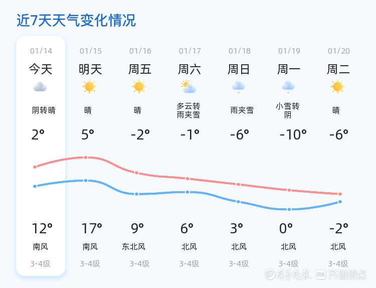 今天是1月14日,星期三,农历十一月廿六。济南市今日天气多云转阴,气温在2℃到12℃之间,东风1级,空气湿度56%,PM2.5指数为90,空气质量良好。全市各区天气情况基本一致,以多云到阴为主,风力较小,适合户外活动。