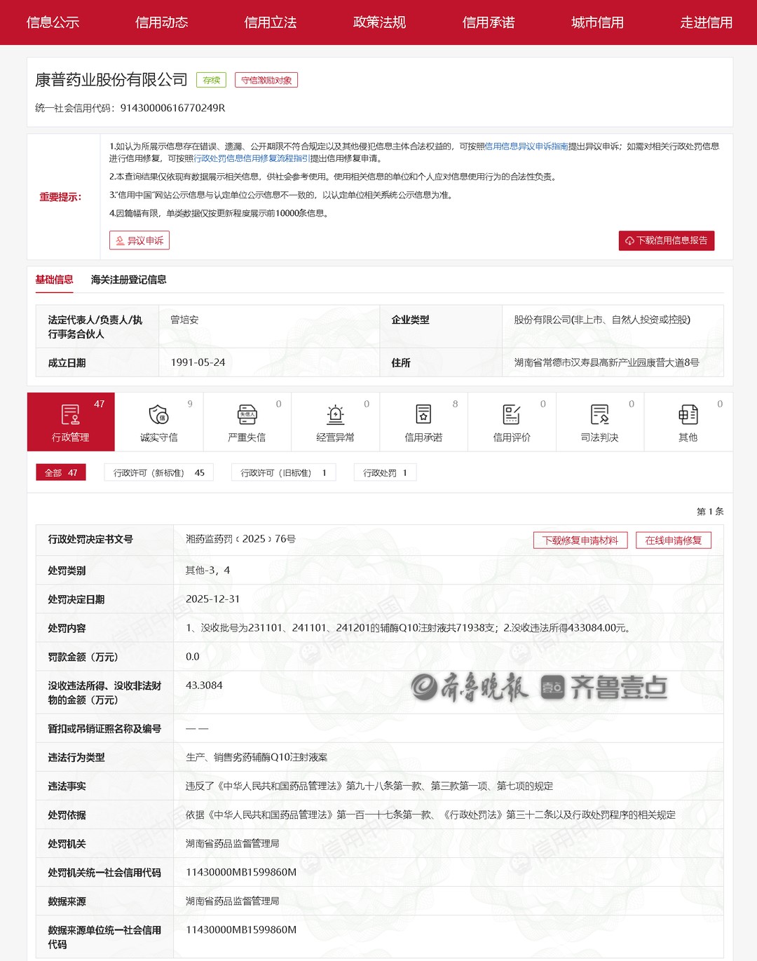 齐鲁晚报·齐鲁壹点记者从信用中国获悉,康普药业股份有限公司因生产、销售劣药辅酶Q10注射液案,被湖南省药品监督管理局行政处罚。处罚内容为:1、没收批号为231101、241101、241201的辅酶Q10注射液共71938支;2.没收违法所得433084.00元。