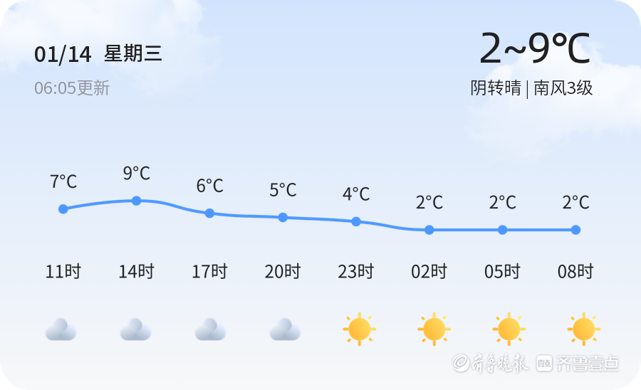 今天是1月14日,星期三,农历十一月廿六。威海市今日天气以阴转晴为主,气温在2°C至9°C之间,南风3级,空气湿度为63%。各区天气情况大致相同,整体较为稳定。
