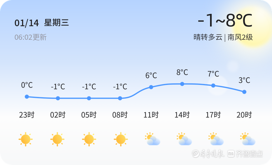 今天是1月14日,农历十一月廿六,东营市天气晴转多云,气温在-1℃至8℃之间,南风2级。各区天气情况基本一致,均为晴转多云,气温适中,适合户外活动。