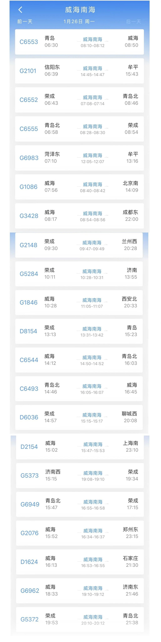 1月26日起,全国铁路将实施新一季度列车运行图。届时每日停靠威海南海站的列车数量增至23趟,南海新区高铁网络通达性实现进一步跃升。