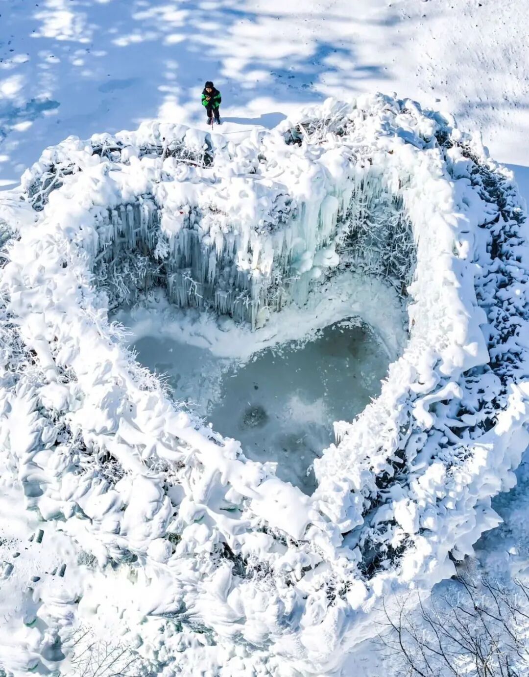 爱心冰瀑:抬头看,天然形成的爱心形状冰瀑!中午光线最温柔,手机开0.5倍广角就能拍出“我和雪乡同框”的浪漫照。