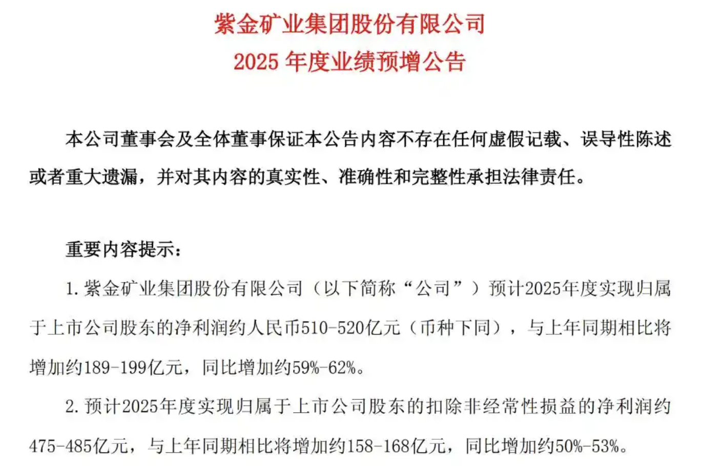 从盈利规模来看,龙头企业表现尤为突出。紫金矿业暂居盈利榜首,预计2025年归母净利润510亿元至520亿元,与2024年同期320.51亿元相比,将增加约189亿元至199亿元,同比增长59%至62%,成为目前预喜阵营中盈利规模最大的企业。