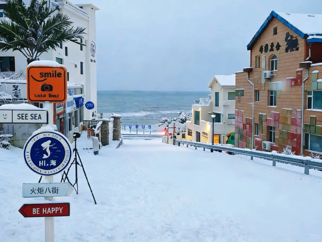 火炬八街,在冬日雪后更显梦幻色彩,从坡顶向下望去,海天一色的图景令人豁然开朗。