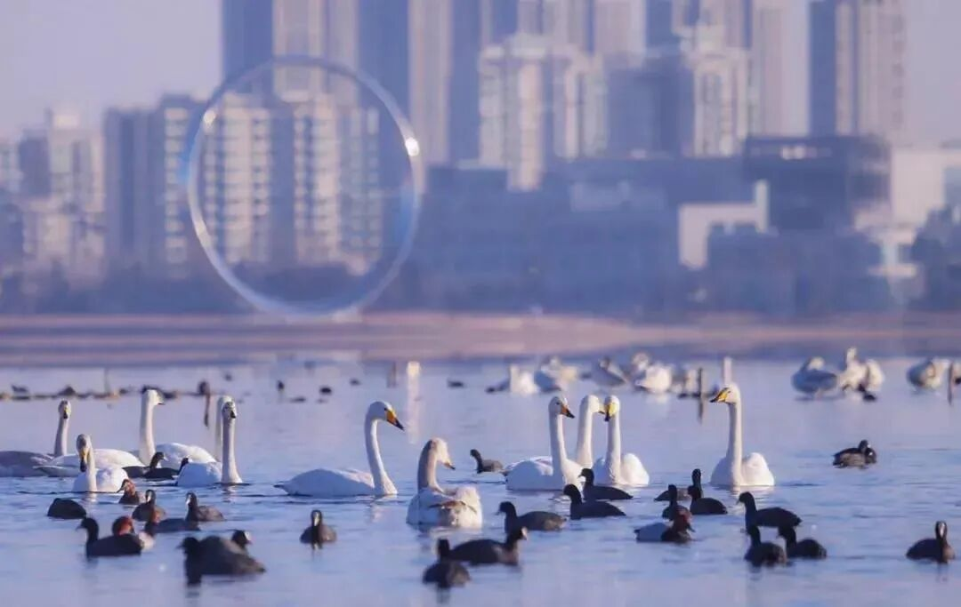 这里水质优越、生态环境良好,秋冬时节,大天鹅在湖面自由游弋、觅食、飞翔,远处的高楼大厦倒映在水中,动静相宜,构成独特的城市生态画卷。