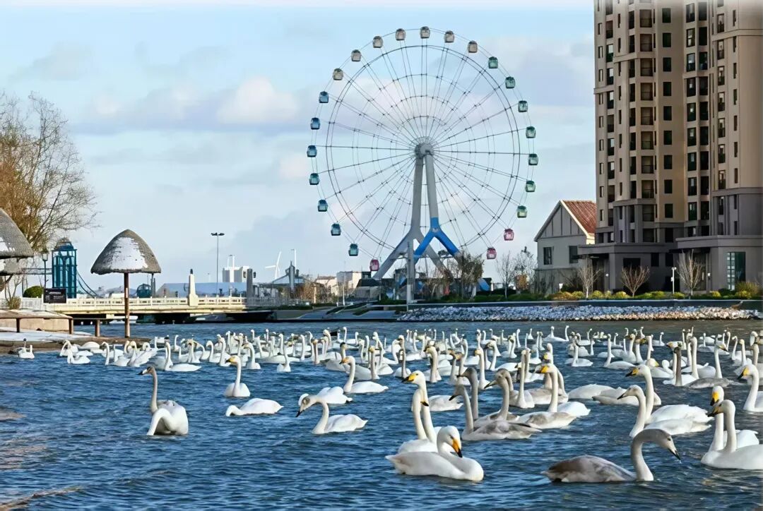 登上缓缓攀升的摩天轮,如同展开一幅动态的画卷——玉兰湖的轮廓在脚下逐渐舒展,湖心岛、枯黄的芦苇与蔚蓝的水面交织成静谧的背景。而那些洁白的天鹅,从高空俯瞰,不再是湖边的点缀,而是这幅画卷里灵动的笔触。