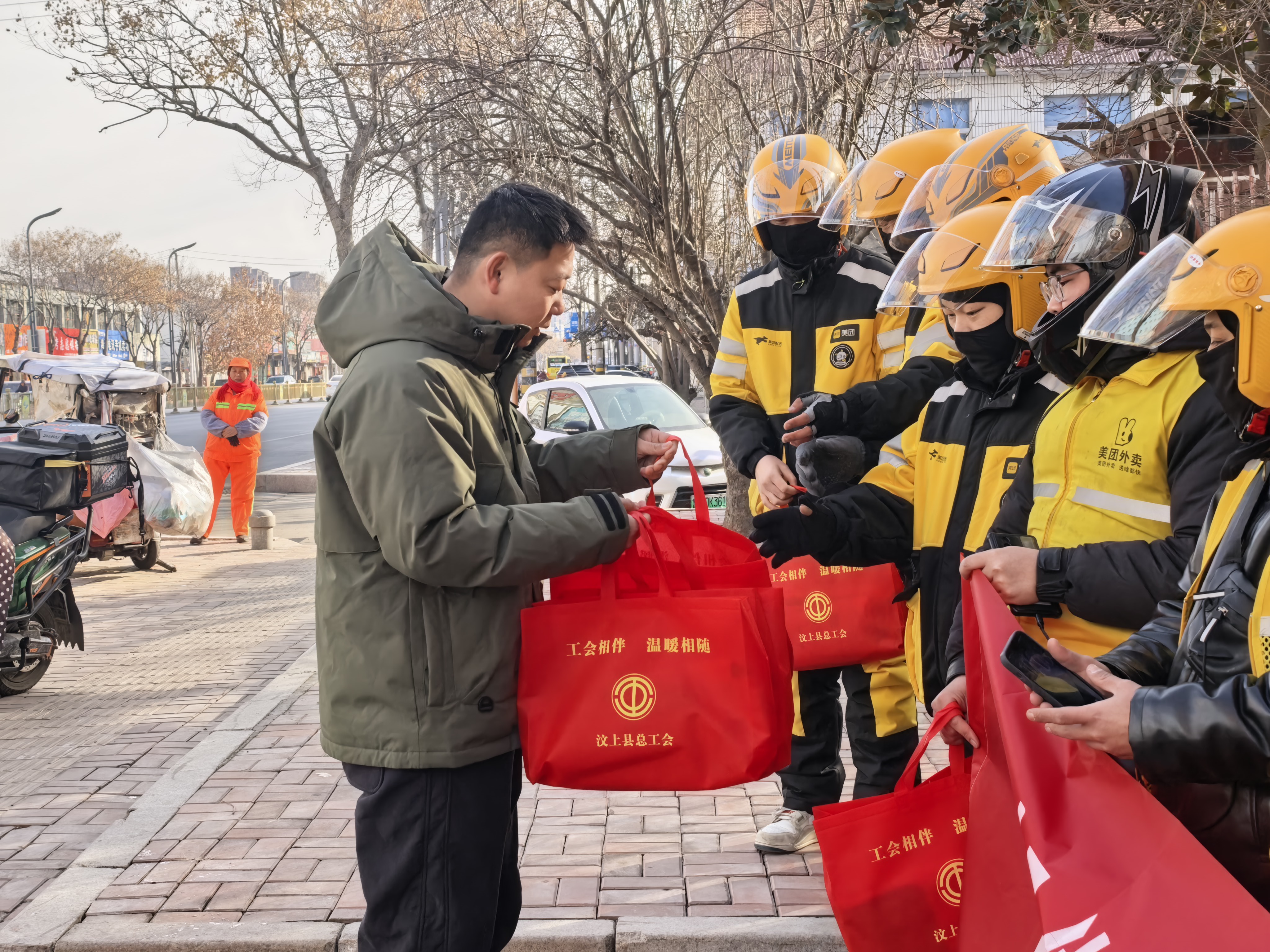 近日,寒潮来袭,气温骤降。为关怀坚守岗位的一线外卖配送员,汶上县中都街道明星社区联合街道总工会开展了“暖冬行动——致敬城市奔跑者”专项送温暖活动,为外卖小哥们送上冬日里的贴心关怀。