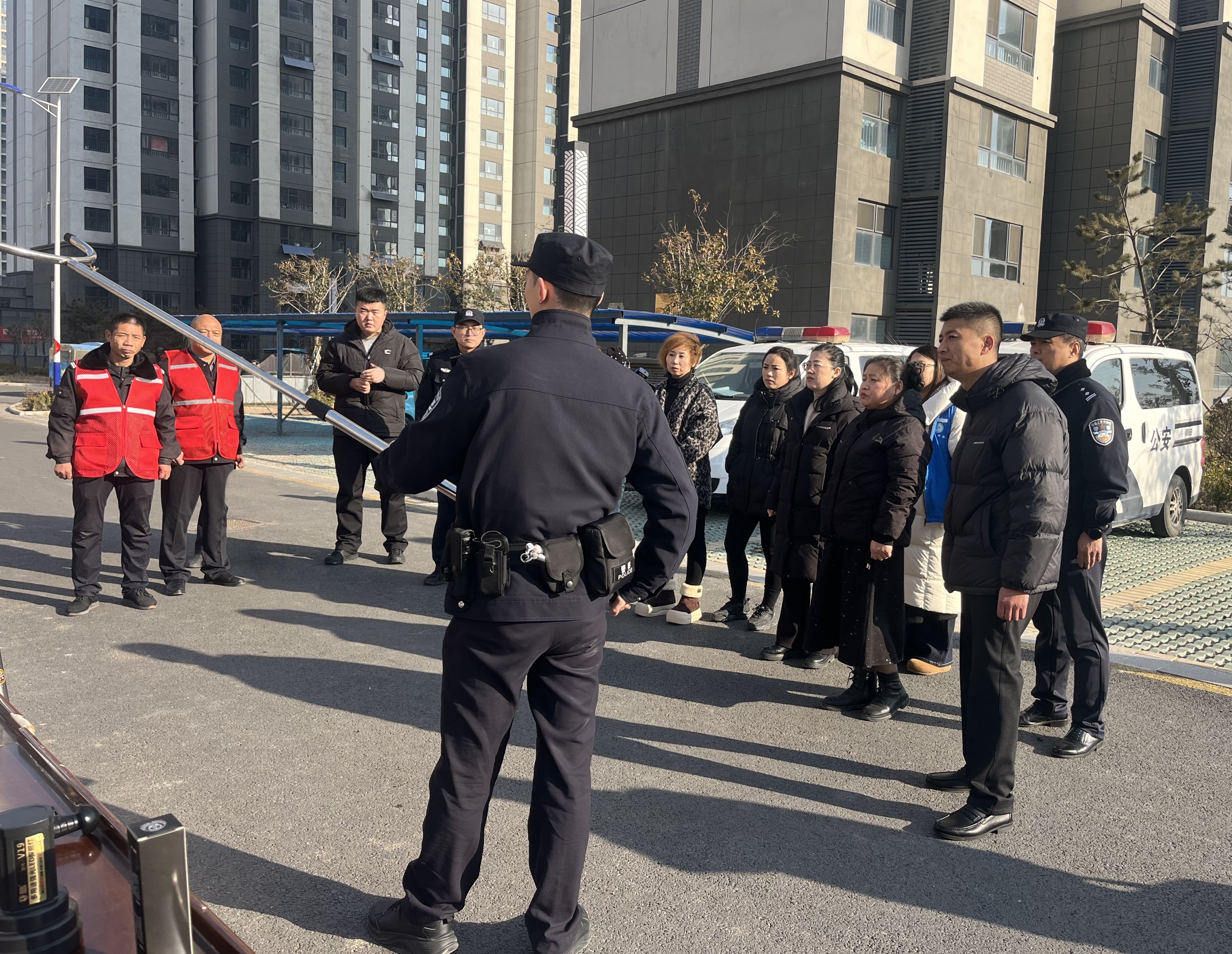 活动现场,民警首先向社区志愿者、网格员和居民代表展示了钢叉、盾牌等警用装备的使用方法,并结合真实案例讲解了突发警情的处置流程。民警的动作演示简洁明了,讲解专业细致,让大家对警务工作有了更直观的认识。