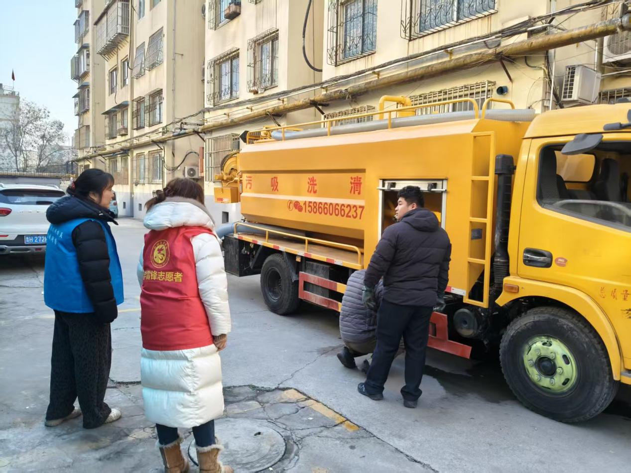 为确保清淤工作高效推进,在清淤现场,志愿者与网格员分工协作,拉起安全警示线、引导居民绕行;专业作业团队对堵塞管道进行“深度诊疗”,挖起井内淤积的泥块杂物后,冲洗管道内壁顽固污垢。