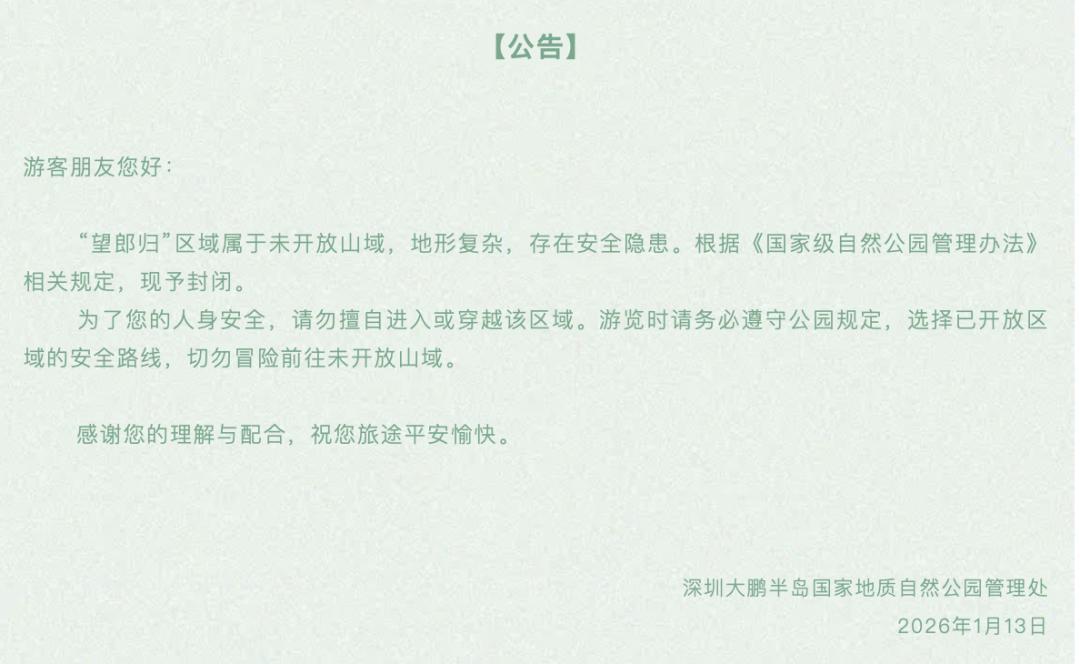 1月13日晚,深圳大鹏半岛国家地质自然公园发布公告称,“望郎归”片区属于未开放山域,地形复杂,存在安全隐患。根据《国家级自然公园管理办法》相关规定,现予封闭。