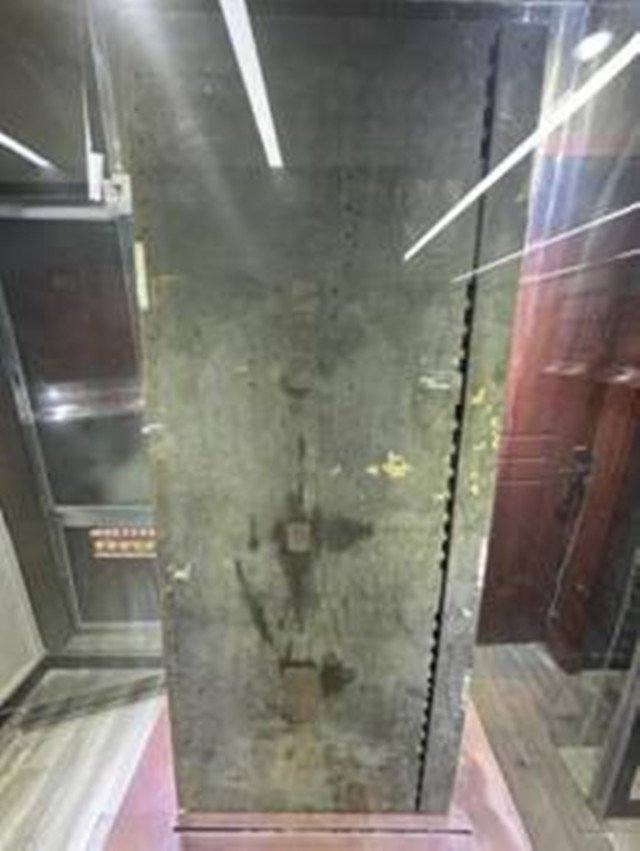 舱板背面,油漆脱落得十分厉害,已经露出木质舱板的本来面目,背面同样有6个孔洞,上方3个孔洞已被铁皮封住,下方3个孔洞只封住了1个。从工艺来看,铁皮并不规则,剪裁的工艺也不成熟,铁钉锈迹斑斑且钉得不扎实,并不具备工业性能,应当是上一位使用者的个人行为。从舱板左侧侧面看,舱板厚度3.50cm,有明显的分层,属于压合板工艺。舱板右侧侧面并非实心舱板,而是由横向木条间隔开的半实心状。从其用途可知,这样既能很好地减重,也能隔离抗压。