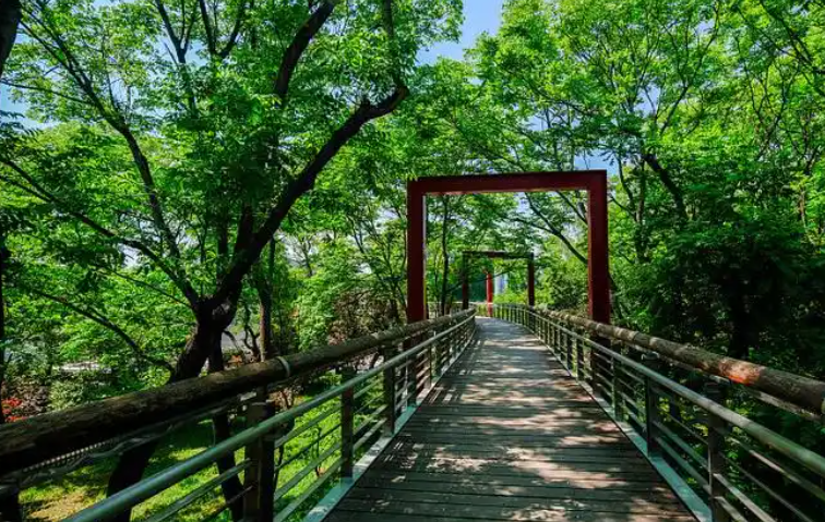 园区内全长820米的生态栈桥,像一条飘逸的丝带,悄悄连接起玉绣河广场与生态广场,不仅留住了满园绿意,更将南区景点、水系和步道轻盈串联。行走其间,仿佛在树梢间漫游,每一步都是风景,每一次转身都遇见新惊喜。