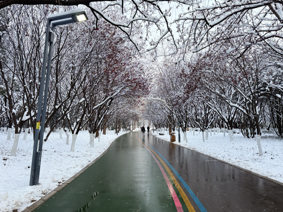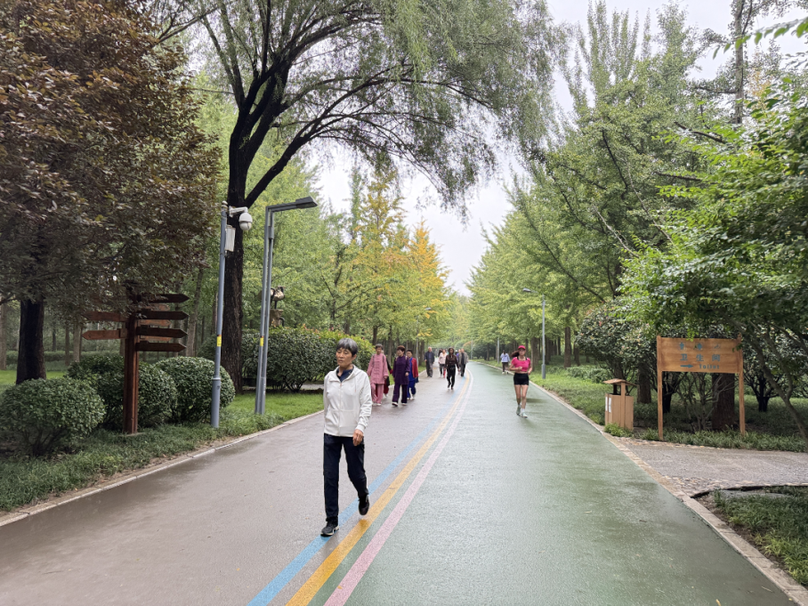 作为全市“万米公园智慧健身步道”的样板段,是2025年全市20项民生实事之一,总长2300米。采用水性MMA防滑树脂稀浆封层工艺精心铺设,整体色调以灰绿融合为主,在中间巧妙嵌入红黄蓝三色的彩色线条,营造出清新自然又不失沉稳的视觉感受。绿道沿线设置了智能数据采集设备、AI智能识别互动大屏和识别摄像头,让市民游客能够感受共享智能健身带来的健康与乐趣。