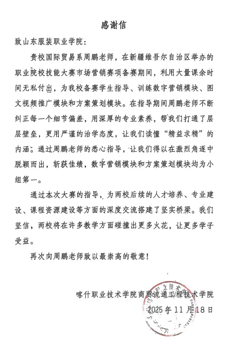 喀什职业技术学院商贸流通工程技术学院专门发来感谢信,高度赞扬了周鹏老师在备赛期间的无私奉献、专业素养与严谨态度,为这段故事写下了一个温暖注脚。