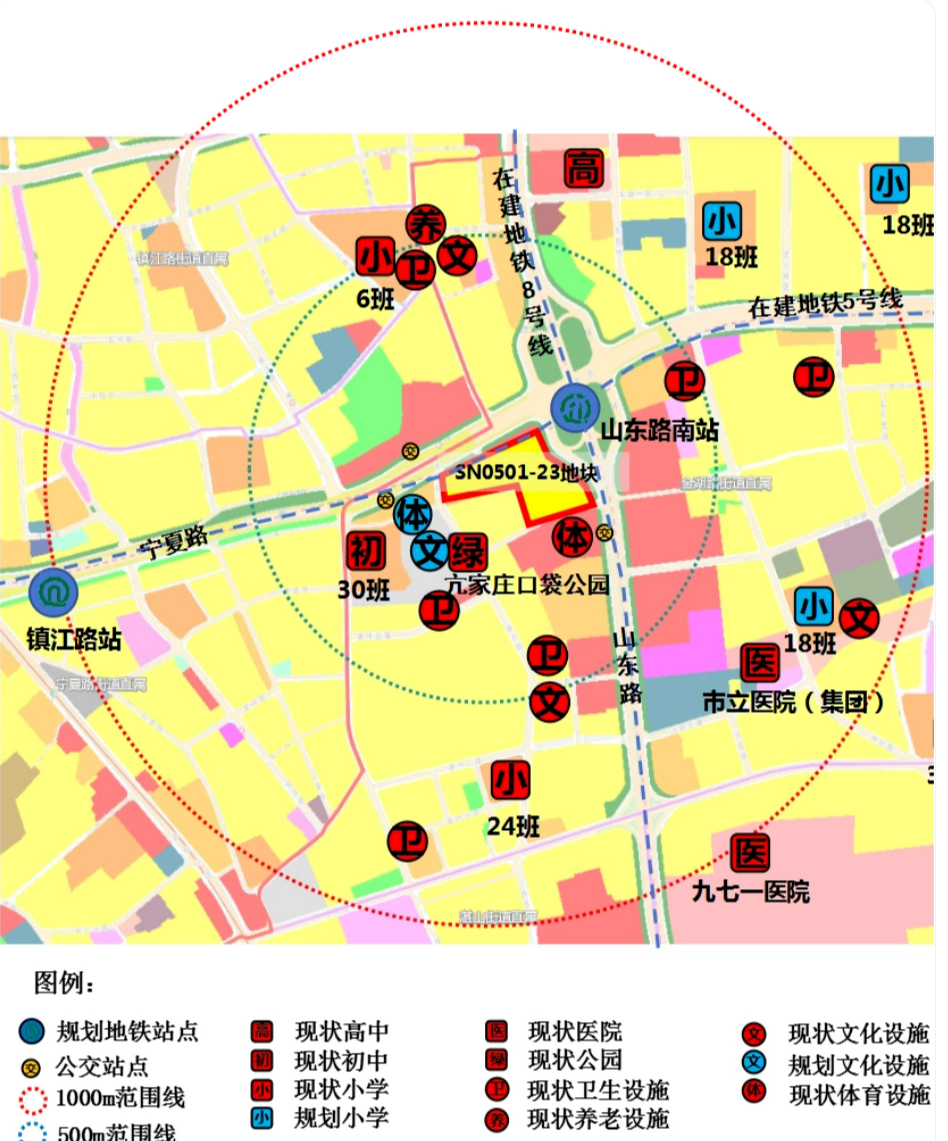 该地块周边公服配套完善,现周边有在建地铁5号线、8号线澳柯玛桥站、镇江路站;公交宁夏路镇江路站、山东路宁夏路站等。周边教育配套有超银中学、镇江路小学、超银小学等,医疗卫生有市立医院(集团)徐州路院区、九七一医院、社区卫生服务站等。周边文体设施包括国奥击剑馆、新媒体基地。城市公园绿地有亢家庄口袋公园等。