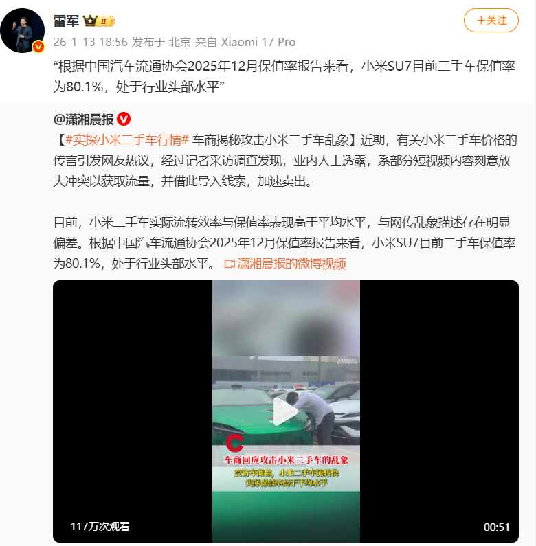 随后,雷军转发了潇湘晨报微博并配文:“根据中国汽车流通协会2025年12月保值率报告来看,小米SU7目前二手车保值率为80.1%,处于行业头部水平”。