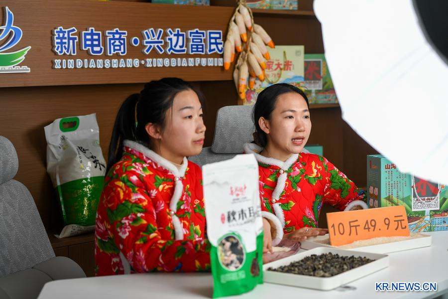 라이브 방송 진행자가 2025년 4월 29일 지린(吉林)성 훈춘(琿春)시 둥아라(東阿拉)촌의 농산물을 소비자에게 소개하고 있다. (사진/신화통신)