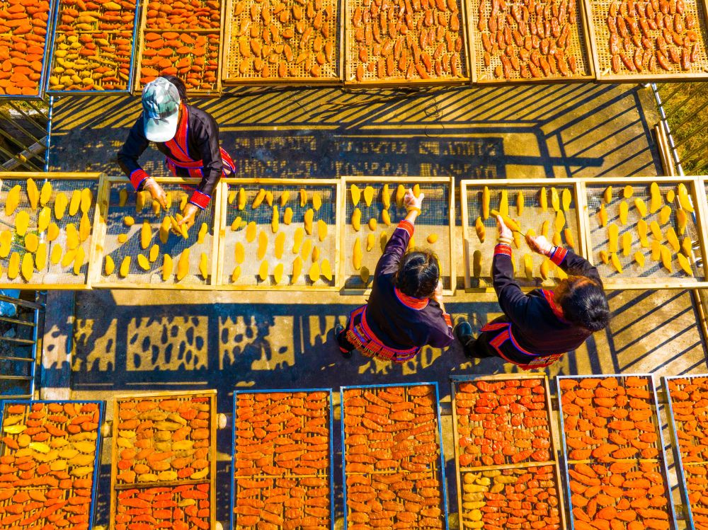 ↑1月12日,广西金秀瑶族自治县忠良乡巴勒村村民在院落里晾晒红薯干(无人机照片)。新华社发(高如金摄)