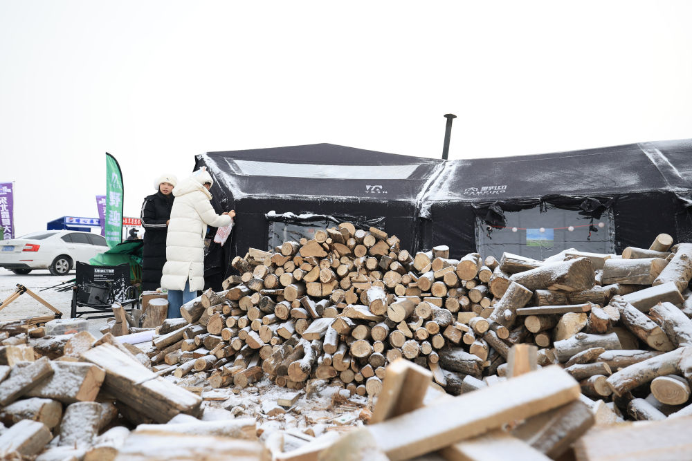 ↑1月12日,在黑龙江齐齐哈尔市举办的第四届东北露营大会现场,露营爱好者搭建帐篷。新华社发(徐率摄)