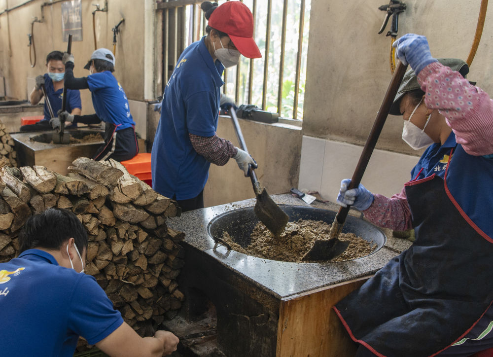 ↑1月11日,海南省琼海市嘉积镇温泉村一家作坊工作人员在翻炒山柚籽粉。新华社发(蒙钟德摄)