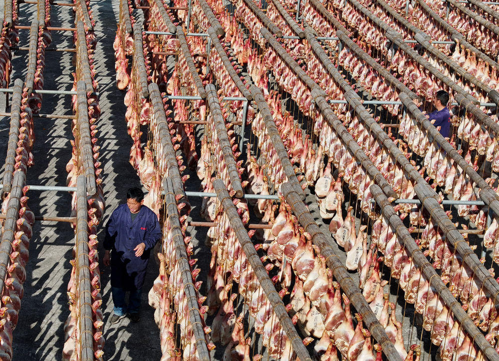 ↑1月13日,工人在浙江省东阳市歌山镇晾晒火腿(无人机照片)。新华社发(胡扬辉摄)
